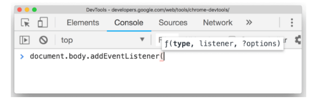 – Arguments Hint : lorsque vous tapez une fonction dans la console, Chrome affichera les arguments possibles pour cette même fonction.